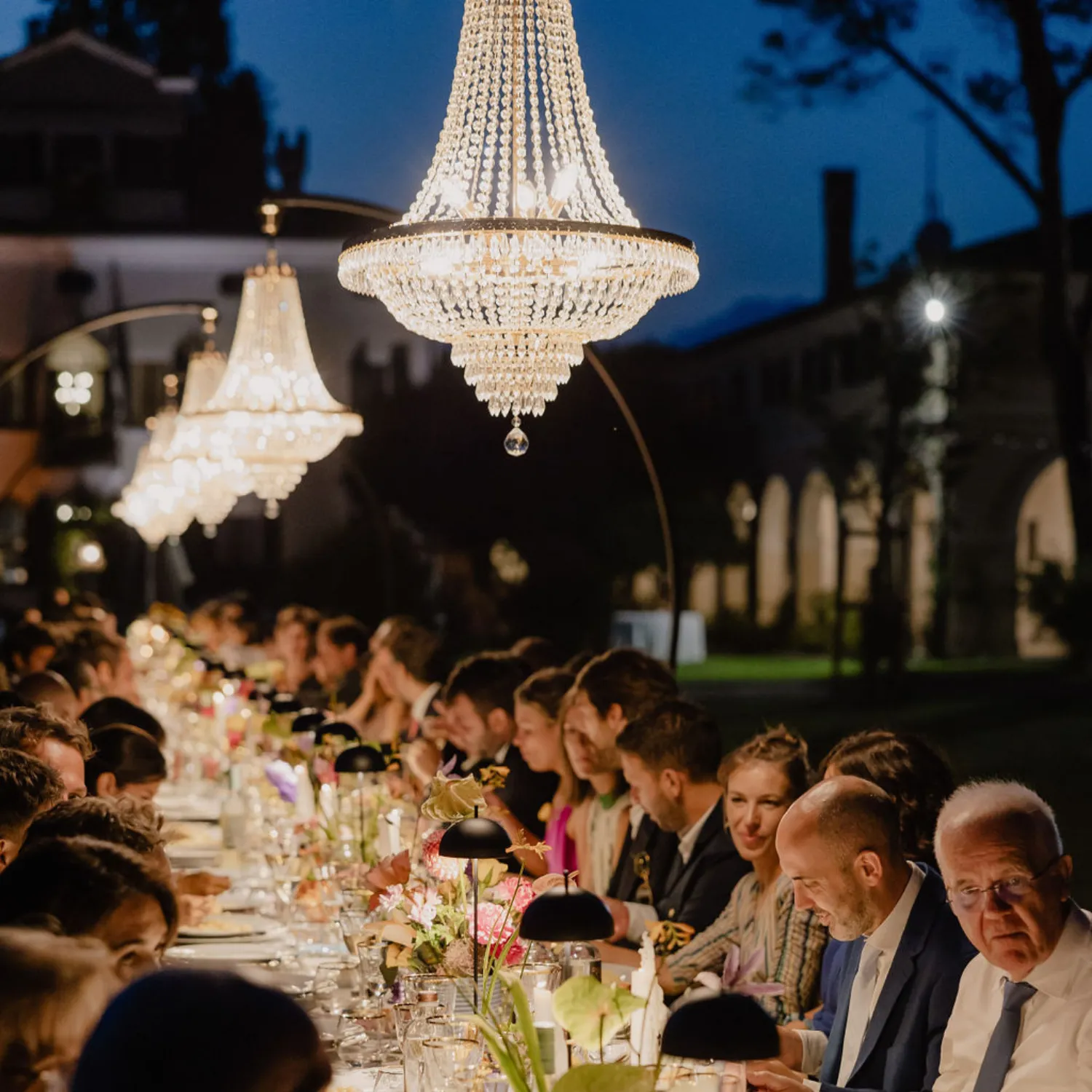 Possiamo illuminare le aree buffet con delle catenarie luminose, la zona del ricevimento con lampade da tavolo e lampadari, e possiamo persino creare giochi di luce con proiettori colorati, che eleganza.